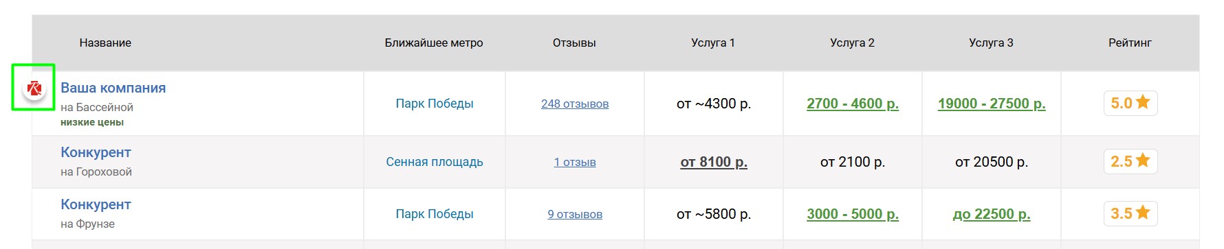 Иконка 16х16 пикселей будет отображаться слева от названия вашего агентства в таблицах, выделяя его среди прочих. Опция увеличивает вероятность перехода на страницу компании и рекомендуется в качестве дополнения к прочим методам продвижения, в первую очередь для агентств с узнаваемым брендом.